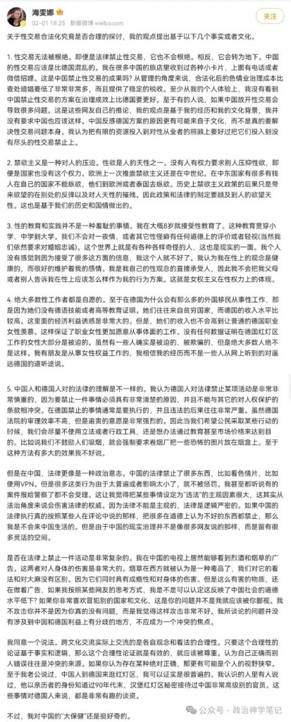 德国的毒品合法化与卖淫合法化,对中国人来说是两个非常令人感兴趣甚至猎奇的话题,海雯娜决定谈论它们的时候,必定预料到文章具有引爆流量的巨大潜力。但扫毒与扫黄是中国不容置疑的政治、经济、文化行为,讨论时稍有不慎便容易引发国人众怒,所以海雯娜的团队与其作为高校青年教师的中国丈夫必须对她的微博言论极尽审查义务,经过详细探讨再决定是否触碰这一话题,如此才能最大限度地避免争议,尤其是来自中国极端民族主义者的攻击。