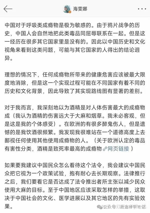 不过这并不妨碍我们给予其文章一个公正的评判。对于德国推动毒品合法化,海雯娜作为德国人给出的理由是:1.中国由于自身历史,对呼吸类成瘾物极其敏感,但在德国的文化背景中,酒精成瘾的危害比大麻成瘾更大;2.在大麻合法化之前,德国吸食大麻的人数已成倍增长,德国政府想要通过合法化来控制大麻的流通渠道,避免泛滥并减少瘾君子;3.建议中国人将此事当作一次政策实验,同时根据自身情况走自己的路。