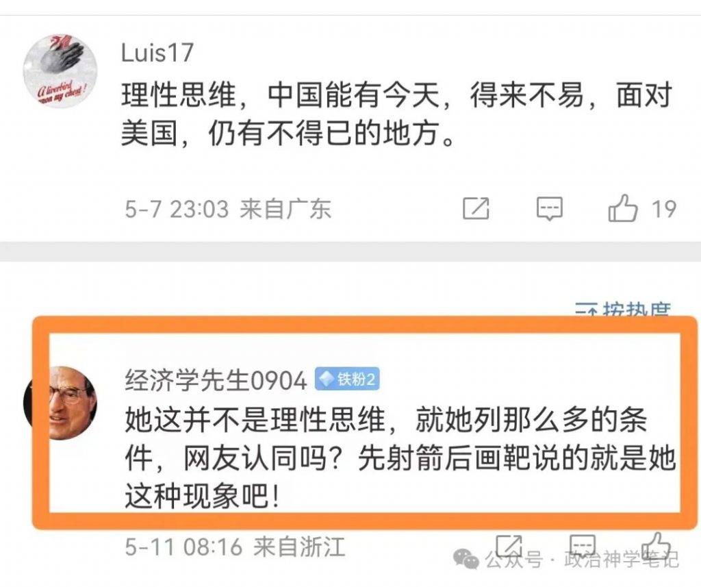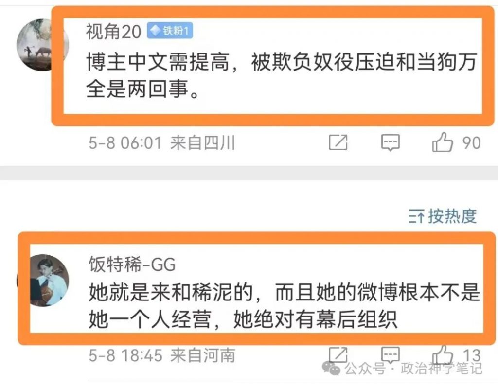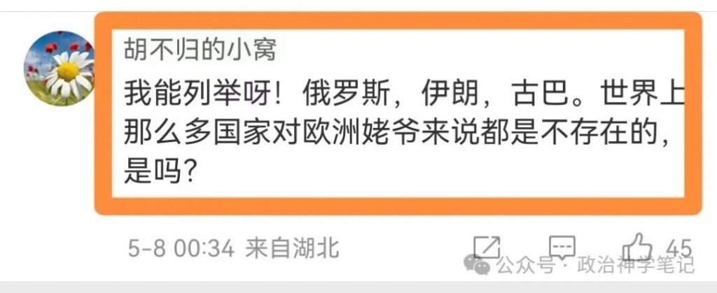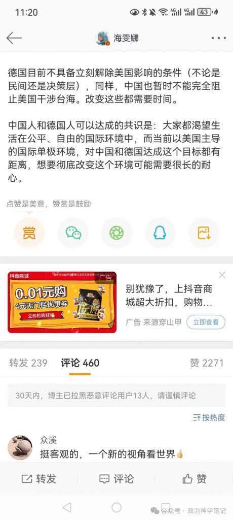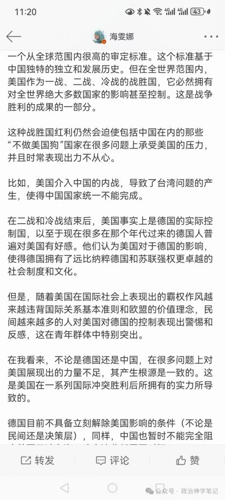 “德国是美国的狗”这句话的潜台词其实是德国政府或德国精英是“美国的狗”,当极端民族主义者用这句话去攻击海雯娜这样的德国老百姓,属于画错了靶子乱射箭,结果却对热爱自己祖国的无辜者造成了实实在在的伤害。所以作为爱面子的德国人,海雯娜回击时显然力求对中国的极端民族主义者造成同等伤害,于是列出六条有助于一国精英抗压”不做狗”的条件。其言下之意是,如果中国没有满足其中任何一条,你怎么知道中国的精英不会投降当狗呢?海雯娜接着搬出台湾问题,使整条微博更加意味深长。台湾是中国领土的一部分,但它现如今却被美国殖民着,谁敢说中国没有承受压力?世界上两百多个国家中,真正独立自主的联合国成员,即使加上俄罗斯、朝鲜、伊朗、古巴,也只有屈指可数的几个。无论从理性逻辑还是客观现实来讲,面对美欧的强势围攻,这些国家无一不处于守势,所以根本不用奇怪,它们内部始终存在一股强大的精英投降派。这部分人已经做好了随时为奴为婢的“做狗”准备,因为他们认为,反抗可能使他们的财富灰飞烟灭,而“做狗”却可以使他们在很长一段时间里高枕无忧。当然,我引申出的这些内容或许都是海雯娜不便说明的,也或许是她未能考虑到的。然而在微博末尾,海雯娜非常中肯地总结了自己的观察——中德都对美国展现出力量上的不足,也表达了德国年轻人的心声和中德之间最重要的共识,那就是期盼有一天将中德彻底从美国的束缚中解救出来。由此共同目标压阵,实在难以理解评论区少数极端民族主义者为何还要对海雯娜的这条微博百般挑剔甚至于强词夺理。